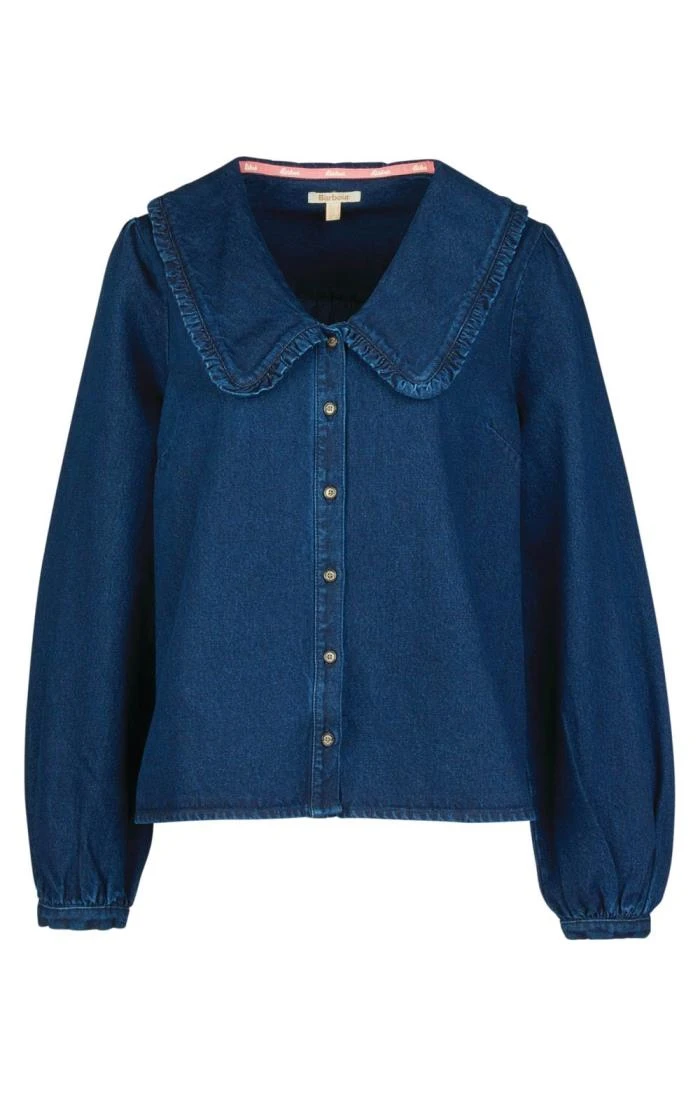 An everyday denim shirt is given a frill of femininity in the 100% cotton Aster shirt by Barbour with its pretty portrait neckline with ruffle edged collar. Finished with mock horn buttons, an elegant gathered back yoke and narrow cuffed sleeves, double up over jeans or paint a picture of contemporary chic with a swinging pleated skirt and heeled ankle boots.