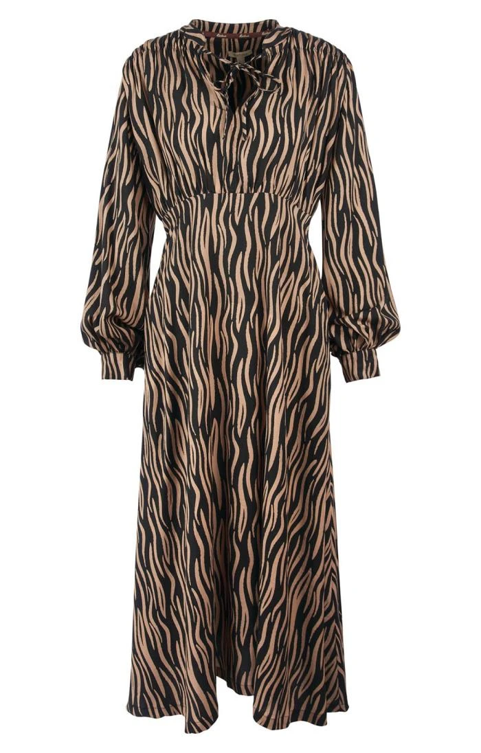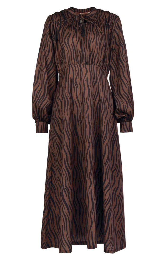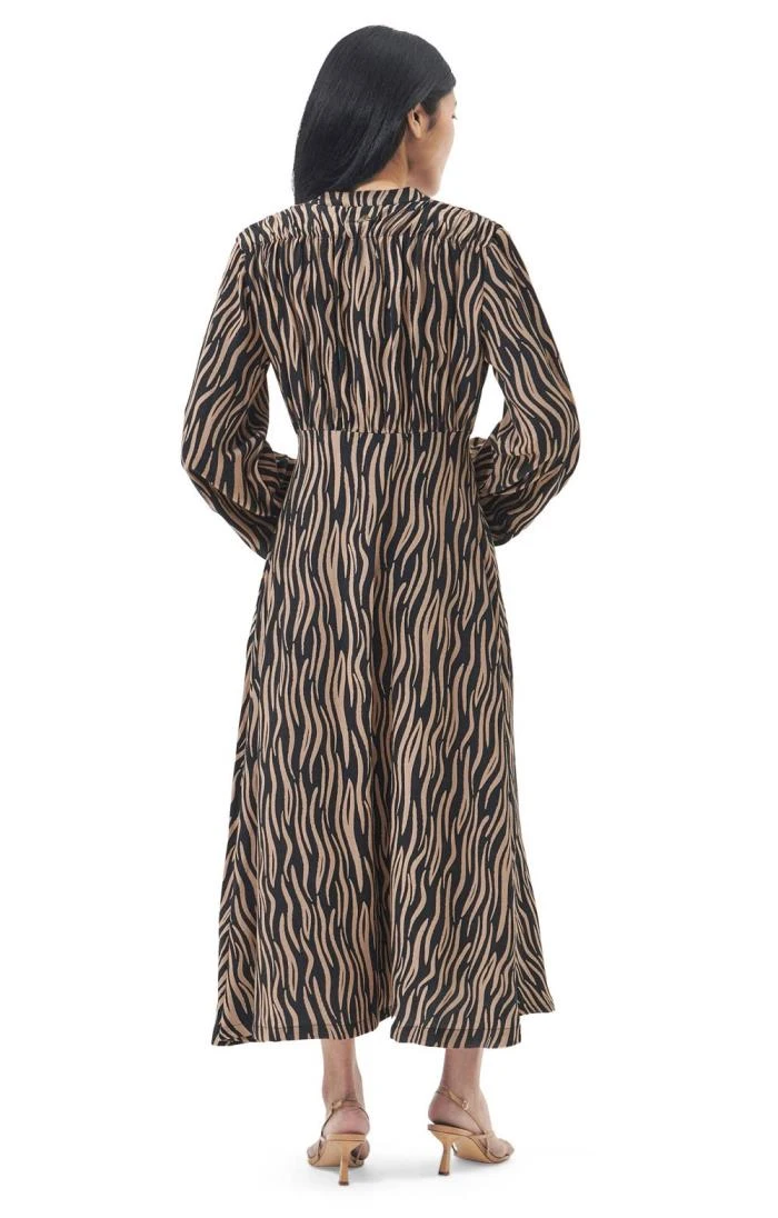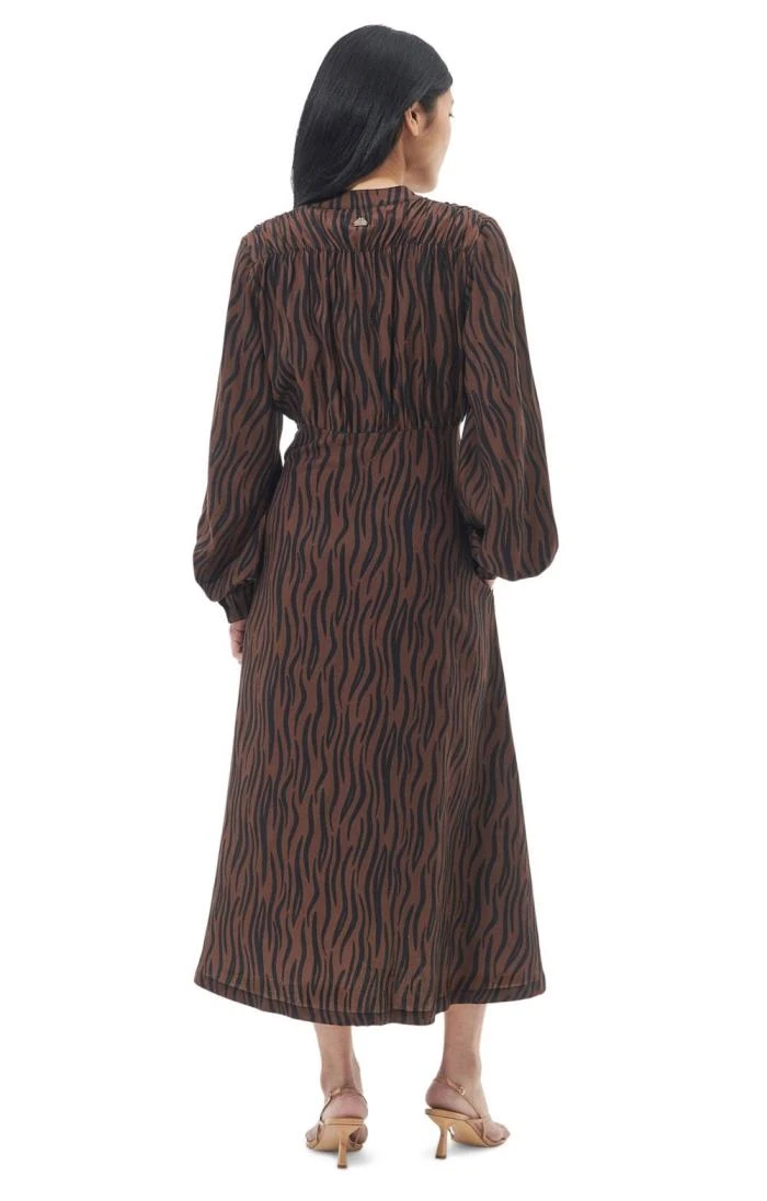 Turn up the style dial this season with this eye-catching ladies Barbour Holkham midi dress in an attractive bark print Lyocell fabric. Elegantly gathered to give volume in the sleeves and the skirt, it features self-coloured neck ties and a short stand-up collar.