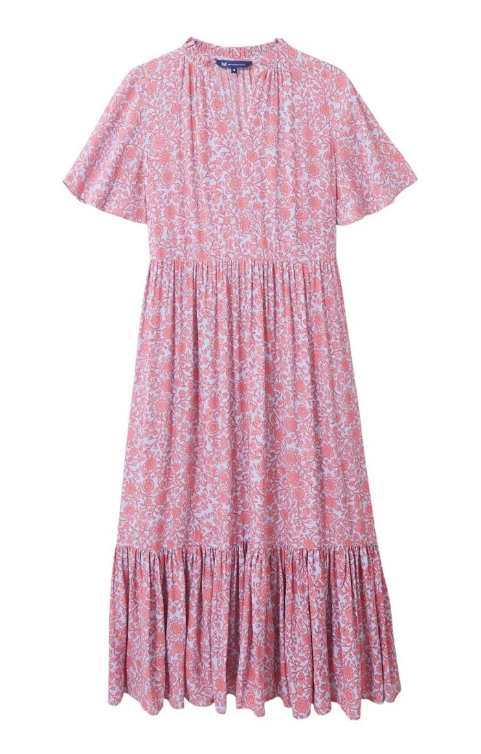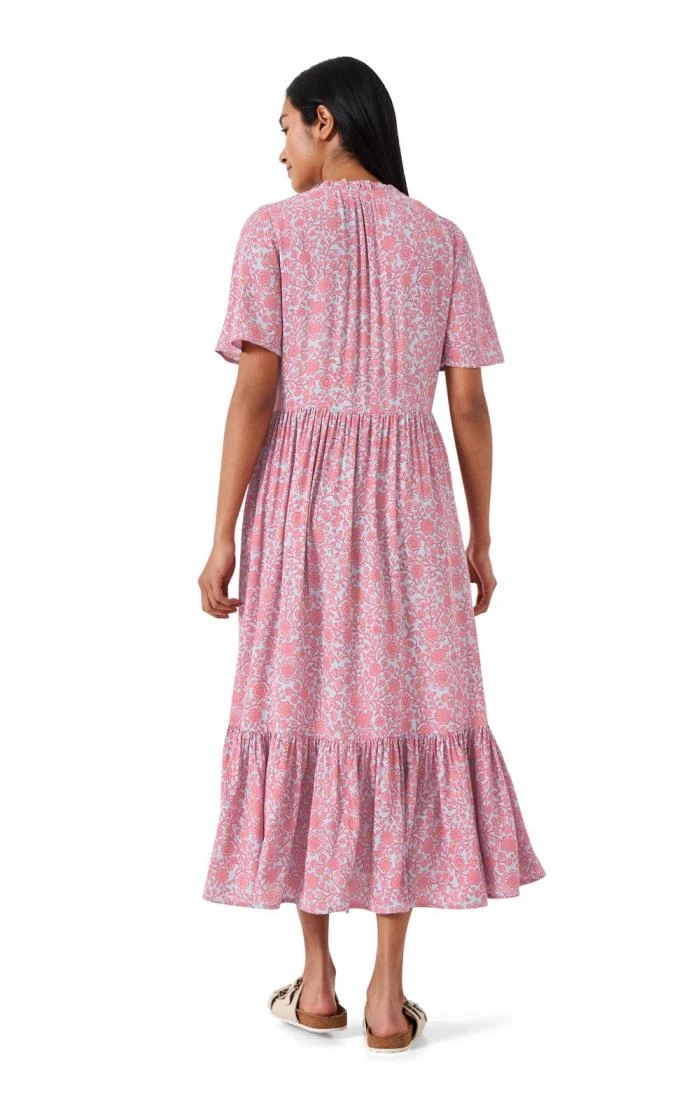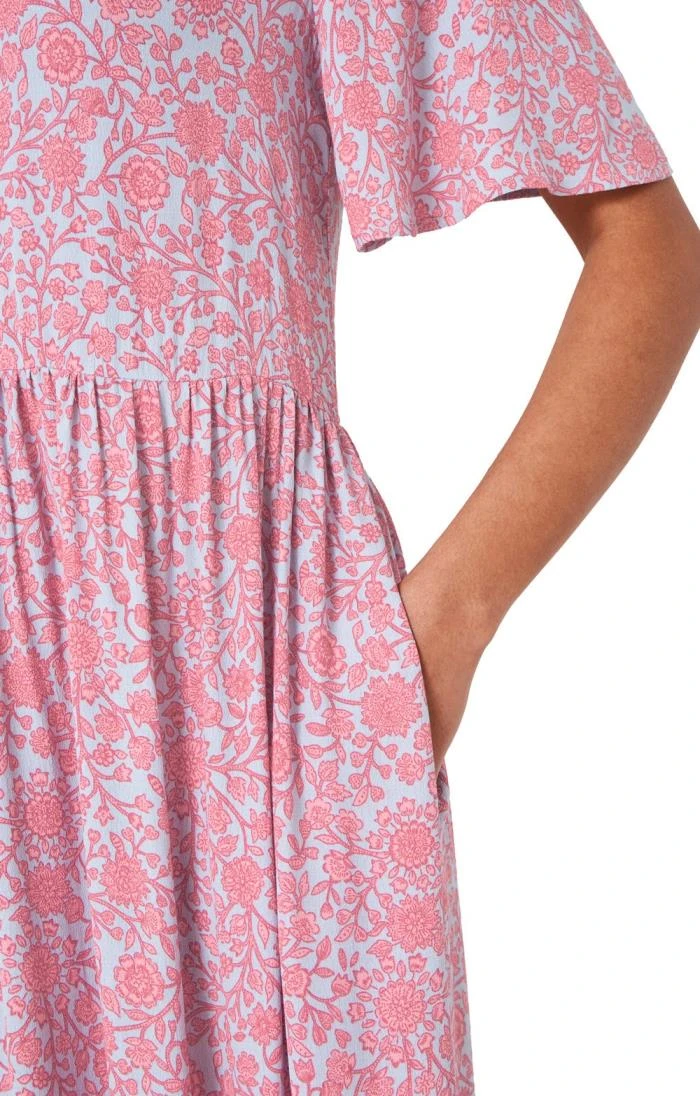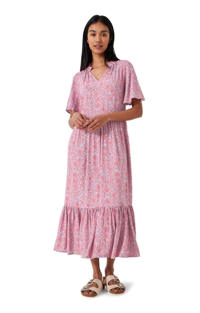 The stunning Crew Clothing Eva dress takes its stylistic inspiration from the exotic equatorial region of the tropics with its colourful floral print. In addition, it promotes comfort with the loose and floating composition of the sleeves, the stylish collar and the swishing tiered hem. In addition, it also has the luxury of discreet hip-level pockets that are perfect for storing your personal effects when out in social situations.