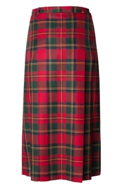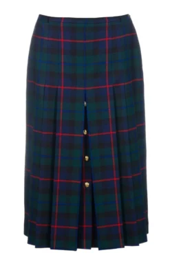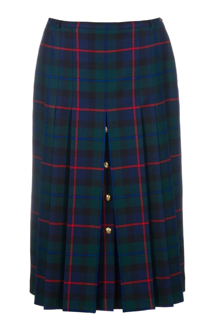 Front and back pleats add texture and movement to this British worsted tartan gold button skirt, a fine example of contemporary country style. With the gold buttons providing an eye-catching focal point, it’s fully lined with belt loops and side button and zip fastening. Made in Scotland.