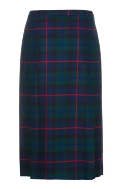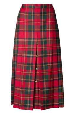 Front and back pleats add texture and movement to this British worsted tartan gold button skirt, a fine example of contemporary country style. With the gold buttons providing an eye-catching focal point, it’s fully lined with belt loops and side button and zip fastening. Made in Scotland.