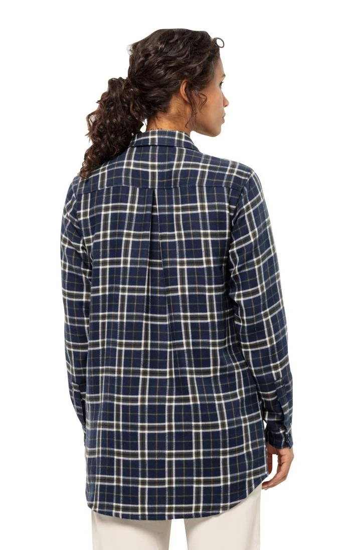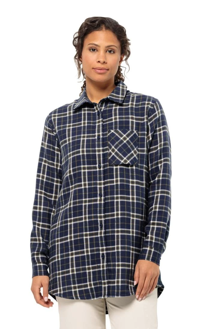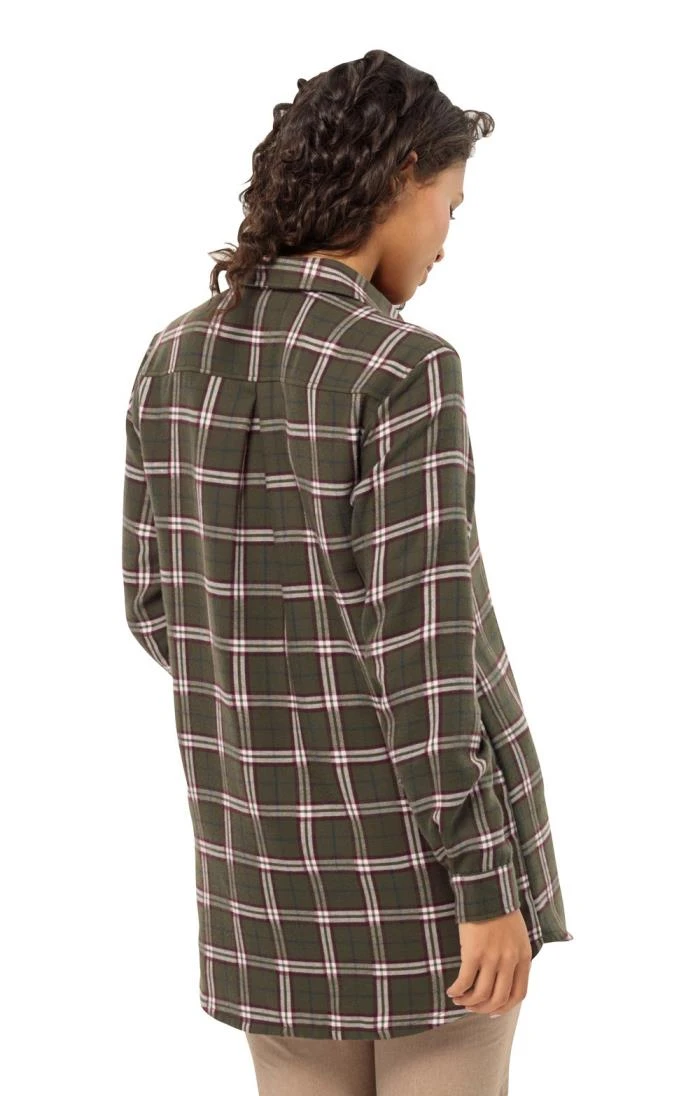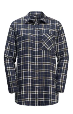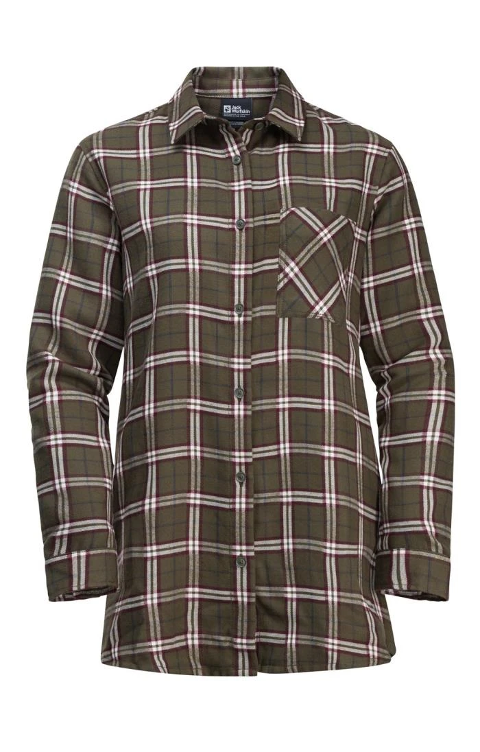 A classic checked shirt in super-soft flannel, this ladies Jack Wolfskin Morgenluft shirt is a popular country style. Boasting a longer, oversized length that makes it great for layering, this attractive overshirt also features a single breast pocket and a colour coordinated button closure.