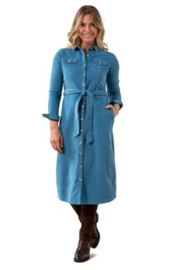Displaying a distinctly retro vibe, the midi shirt dress by Lily & Me will swing you back to the seventies with its muted cotton corduroy fabric and slightly flared skirts. An enduring classic for a reason, its button-through front, fabric tie belt, flapped chest pockets and casual hand pockets are a study in informal dressing with an eye for eternal relevance. Embrace the look over a finely knitted roll neck and knee-high boots.