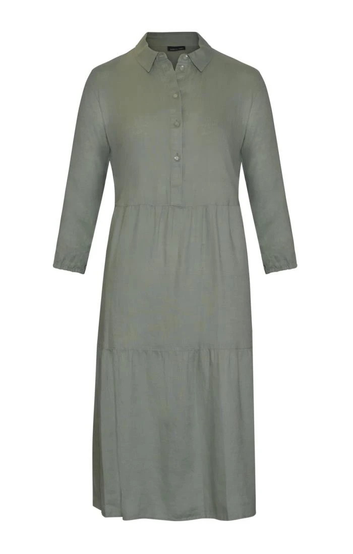 Keep cool and carry on dressing in comfort and style in this simple yet stunning 100% linen dress with its shirt collar neckline, figure flattering tiered skirts and gently gathered three-quarter length sleeves. Falling to a mature length just below the knee and finished with casual in-seam pockets, this easy-wearing essential is the perfect grab-and-go piece to make your season go with a swing.