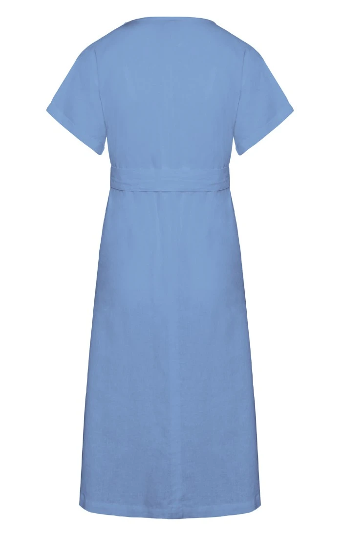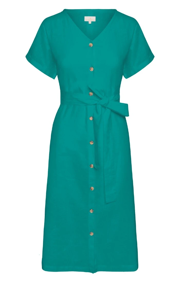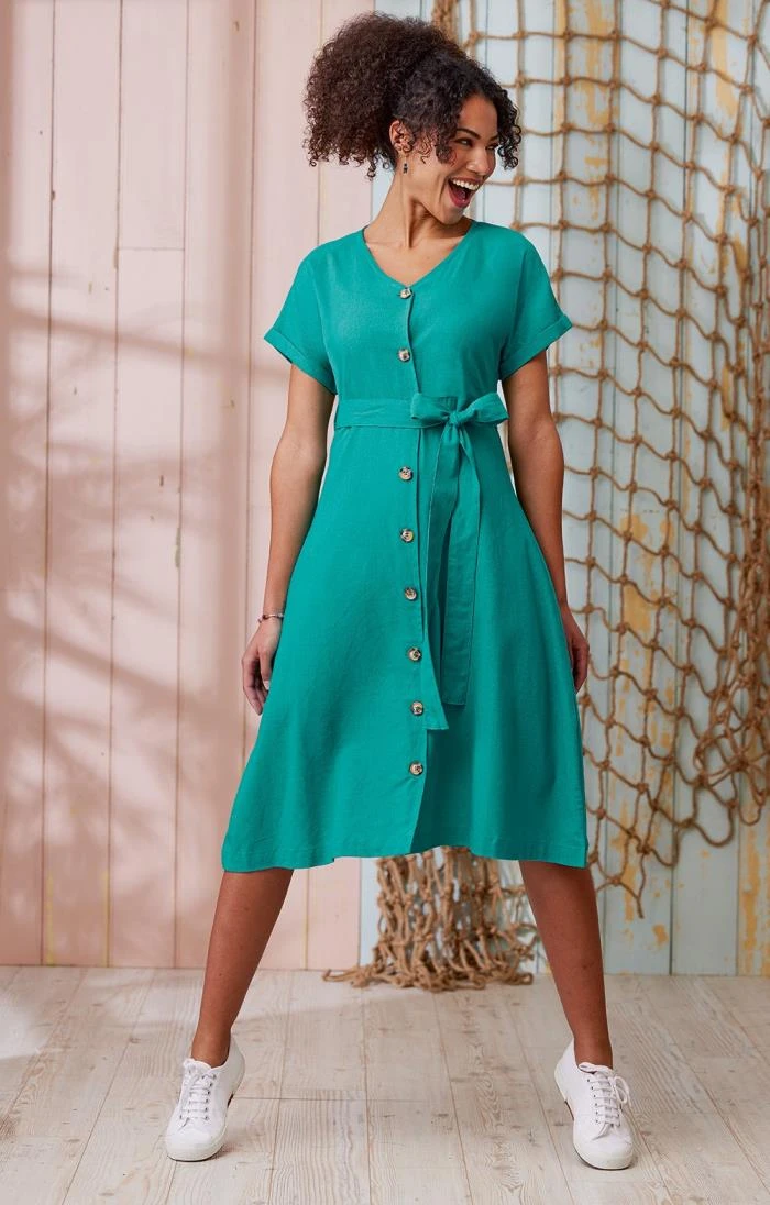 Cut to below the knee with a slightly flared skirt and a neat V-shaped neckline, this truly lovely linen mix button front dress will transform your everyday summer style. The viscose and linen blend lends a wonderfully smooth drape without excessive creasing, while the wide fabric belt and turn-back capped sleeves add a mildly retro feel to this sweet and swingy new season staple.