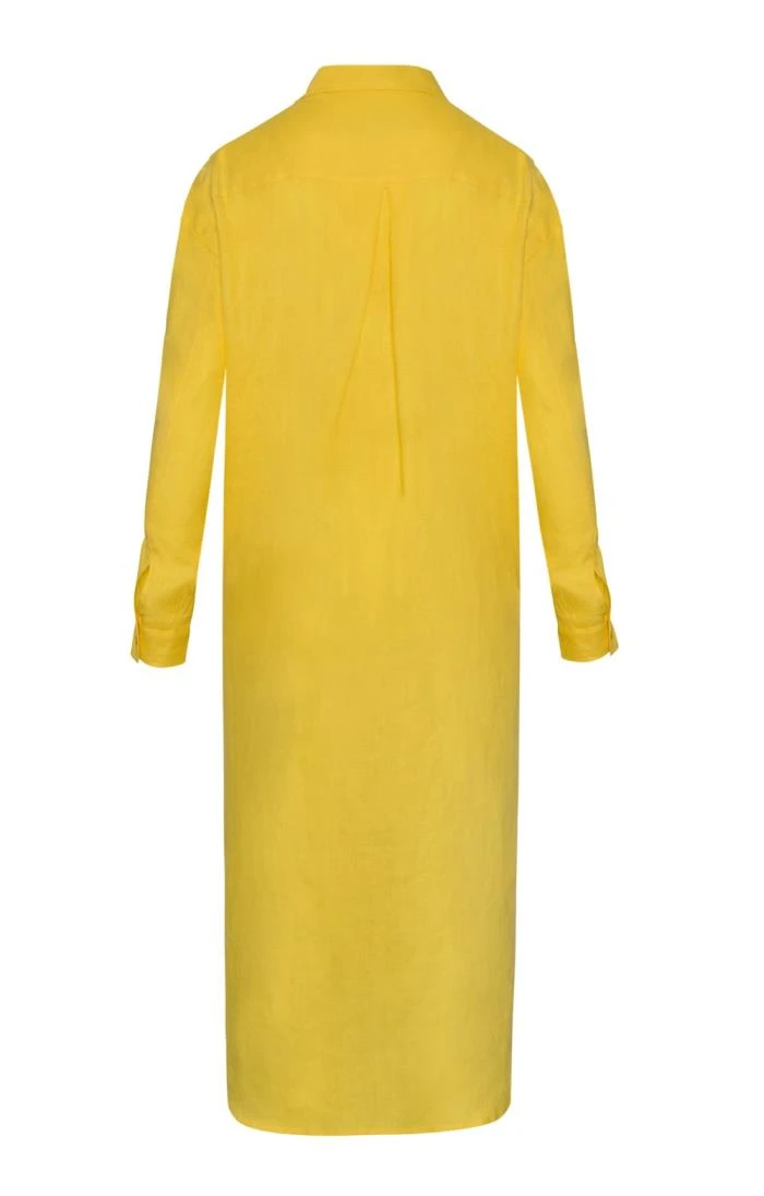 A long linen shirt dress with traditional shirt collar, button front and sleeves that can be worn long or rolled up and held in place by a button-tab feature. Dropped shoulders accentuate the relaxed feel and a large patch pocket gives you a home for your handkerchief, should you carry one. The curved shirt-tail hem keeps it feminine and flattering. This is a dress to keep you cool and comfortable while looking super-smart and elegant.