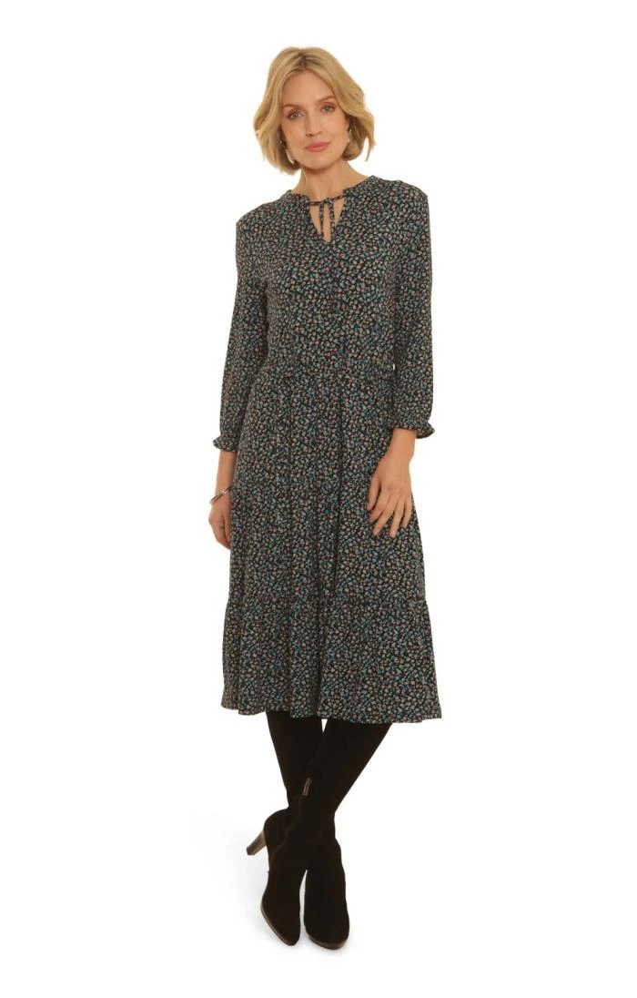 An elegant outfit that transitions effortlessly from daytime to night, this ladies Pomodoro Ditsy tiered dress is an exquisite choice. Gathered at the waist and boasting a fun tiered skirt, it shows off its youthful sense of style with a bold print and ruffled cuffs. Pair with long boots with a chunky winter heel for a delightful look that simply radiates sophistication.