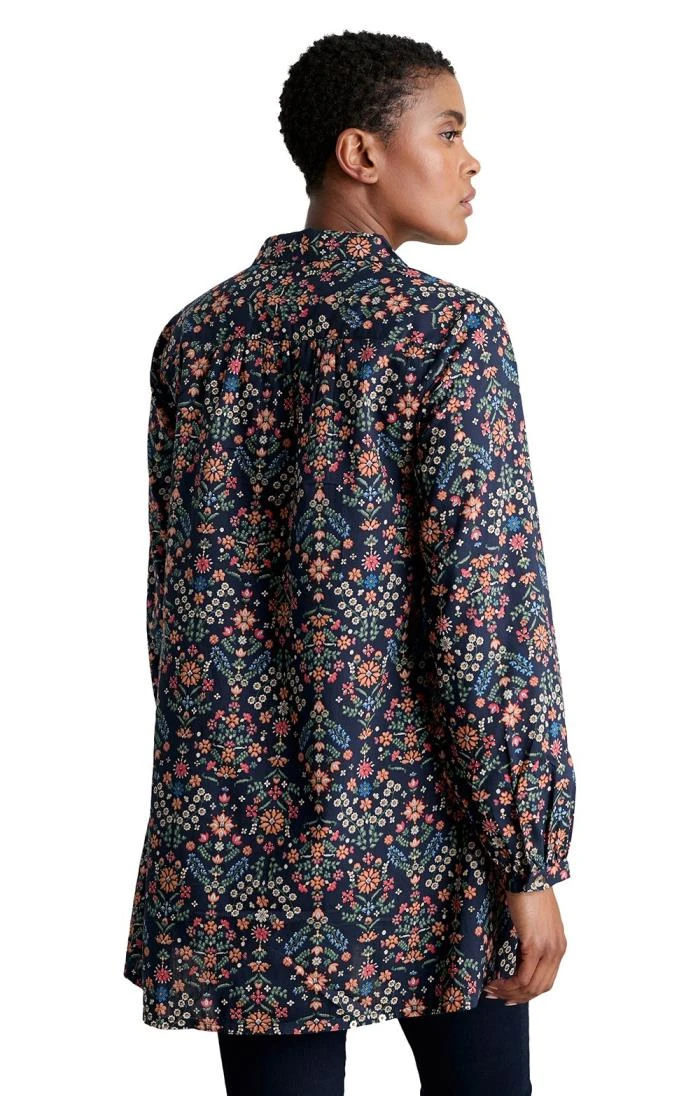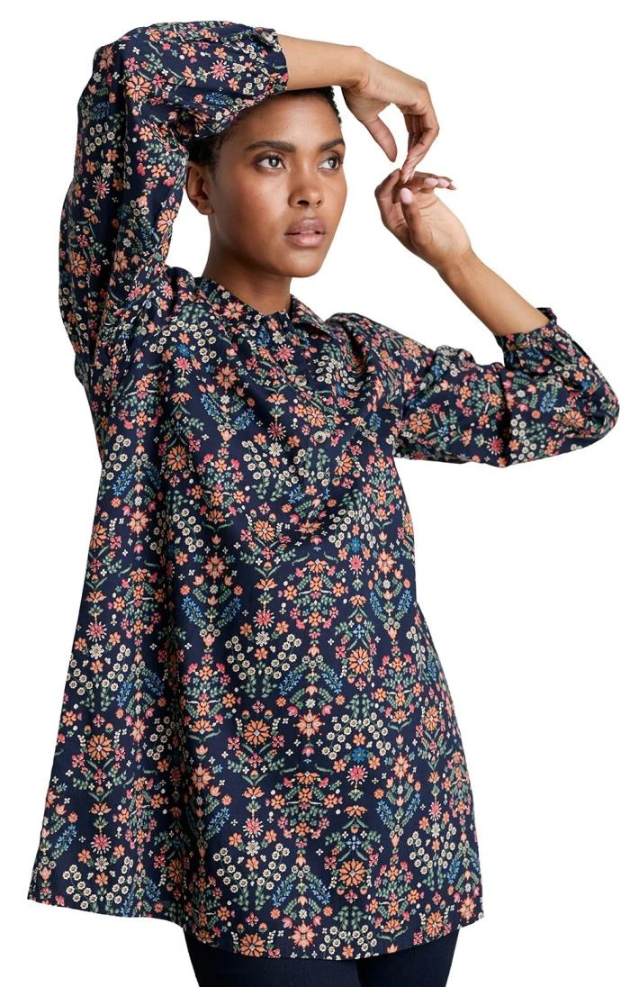 Indulge in the luxury of the blouson-style Wishing Gate tunic top, a piece that exudes a special romantic charm. With a soft pointed collar and delicately gathered cuffs, it captures an elegance that’s both timeless and versatile. Soft gathers along the back yoke create an airy and comfortable fit, ensuring that you move with effortless grace. This tunic is not just about style; it’s a testament to ethical fashion, certified organic to Global Organic Textile Standards (GOTS) by Soil Association Certification DK16784. Pair it with plain, narrow trousers to let the meticulously handcrafted print and the vivid colours inspired by Cornwall shine. The A-line silhouette brings a touch of artistry to your wardrobe, making this tunic an embodiment of conscious fashion and enduring beauty.