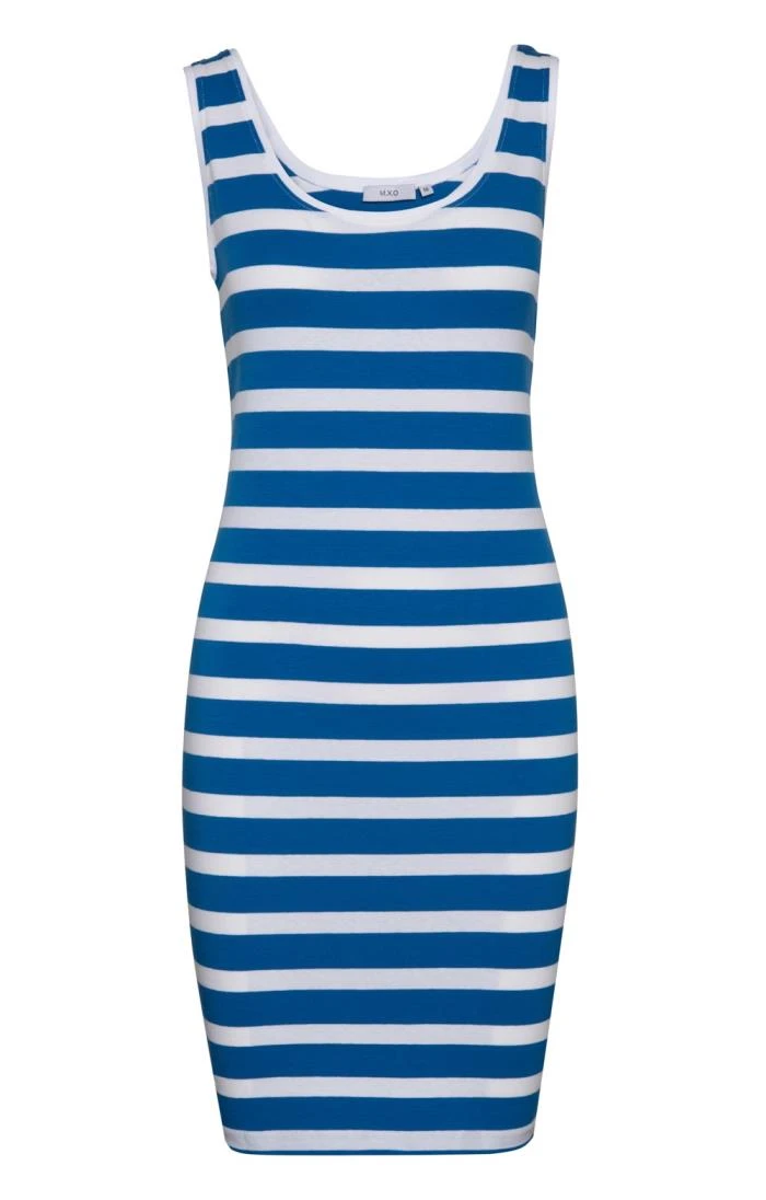 Greet the summer sun in style with this fabulous yet simple sleeveless striped dress, perfect for a lazy day at the beach or even just a walk in the park! Featuring horizontal stripes throughout, this dress is crafted from finest cotton with a hint of stretch for a comfy and breathable fit that is also supremely flattering.