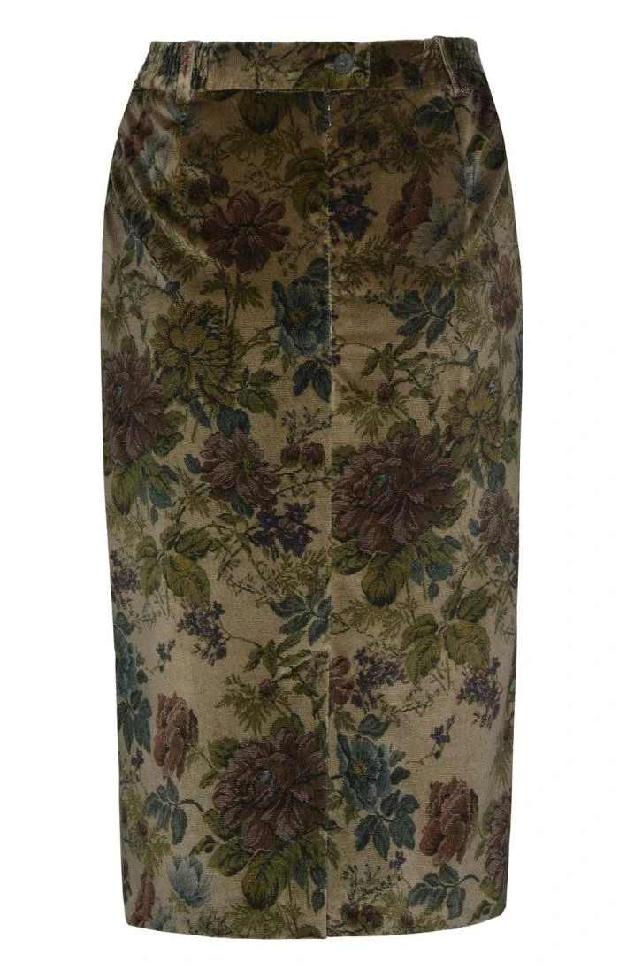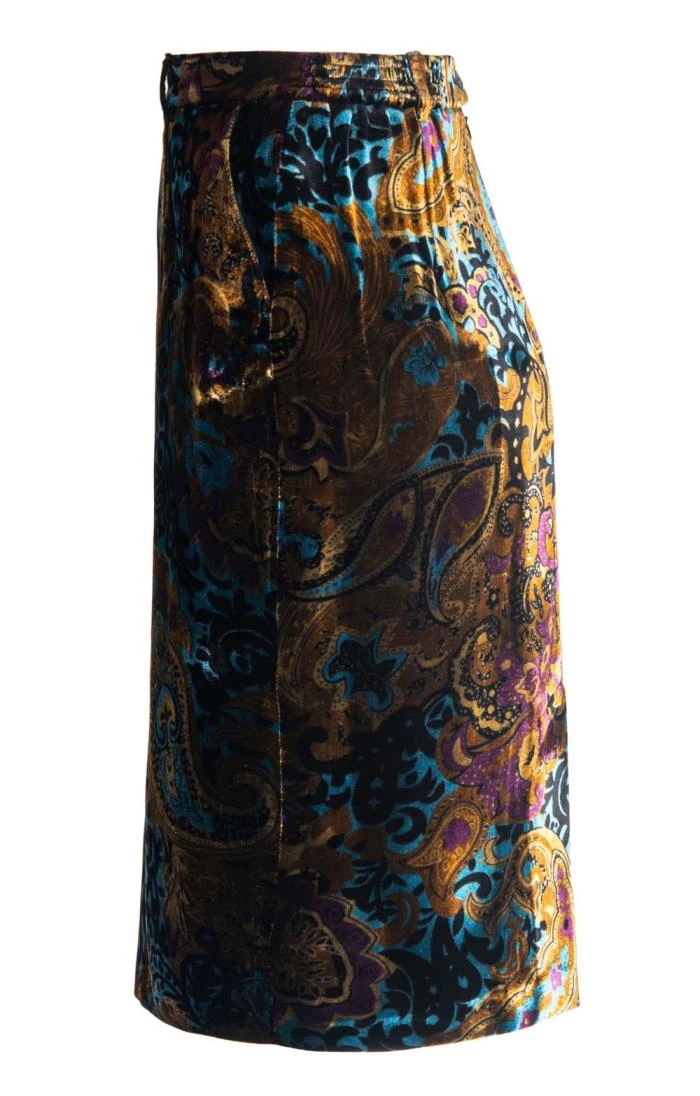 Iridescent jewelled tones shine out from this tailored velvet skirt as it shimmers in the light, revealing an intricate paisley pattern that can’t fail to turn heads. The ideal choice for those extra-special occasions.