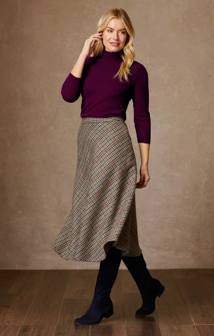 An easy movement and luxurious drape mark out this British tweed swing skirt as something really special. Fully lined with concealed slanted side pockets to maintain its graceful lines, it’s a charming and versatile piece that will find pride of place in your country clothing collection.